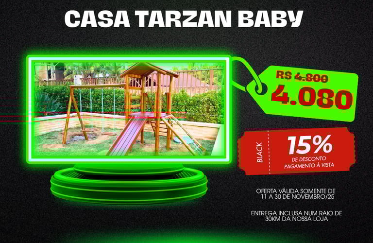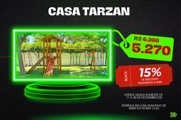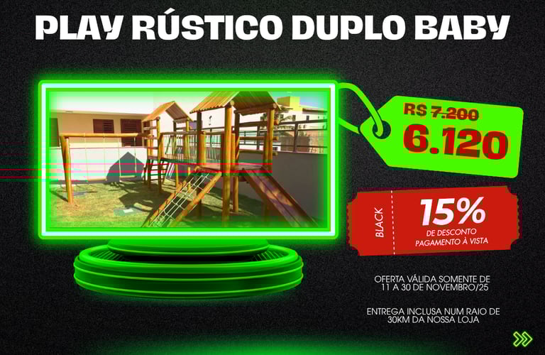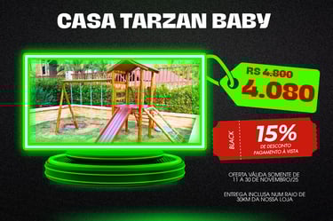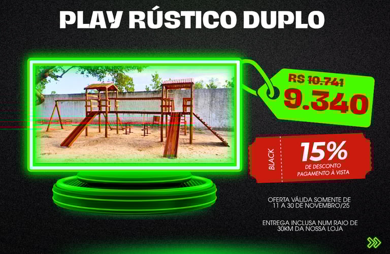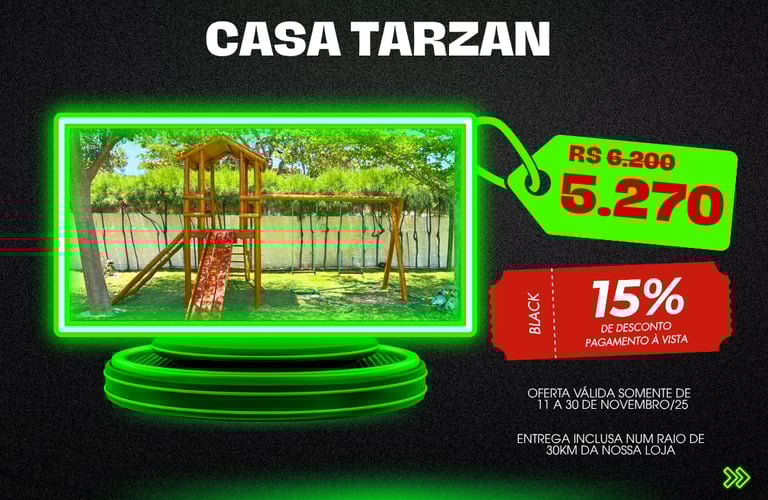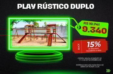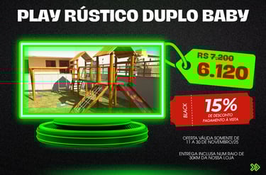 Aproveite a Black Friday Carneiro Brinquedos e garanta 15% de desconto à vista em nossos parquinhos infantis, casas Tarzan e pontes duplas.